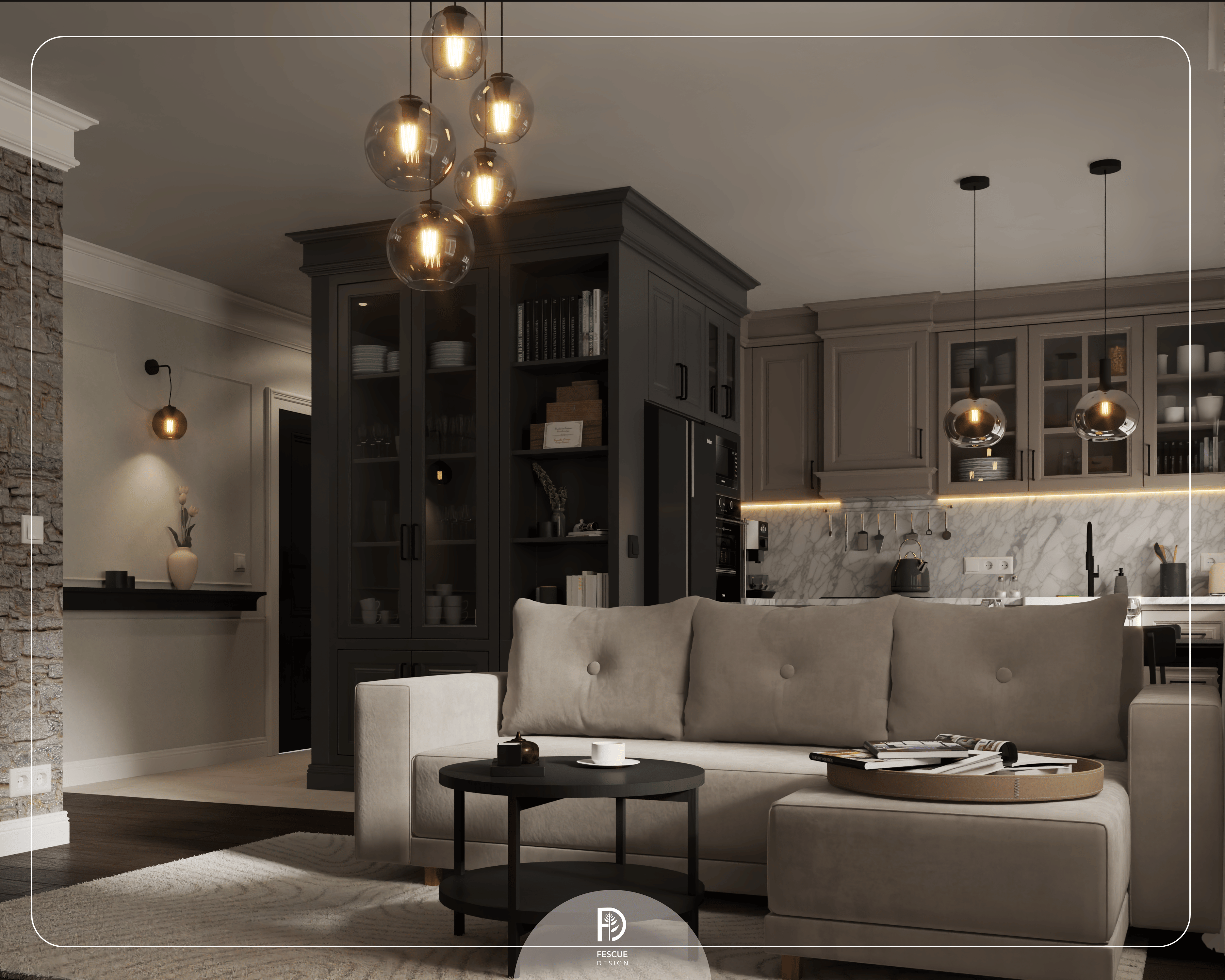 Głównym motywem przewodnim mieszkania jest wydzielenie kolorem czarnym strefy wejściowej. Pozostała część utrzymana jest w beżowej i ciepłej kolorystyce. Fronty projektowanych mebli mają ozdobne frezowane wzory, dzięki czemu wnętrze nabywa charakteru Modern Farmhouse.
