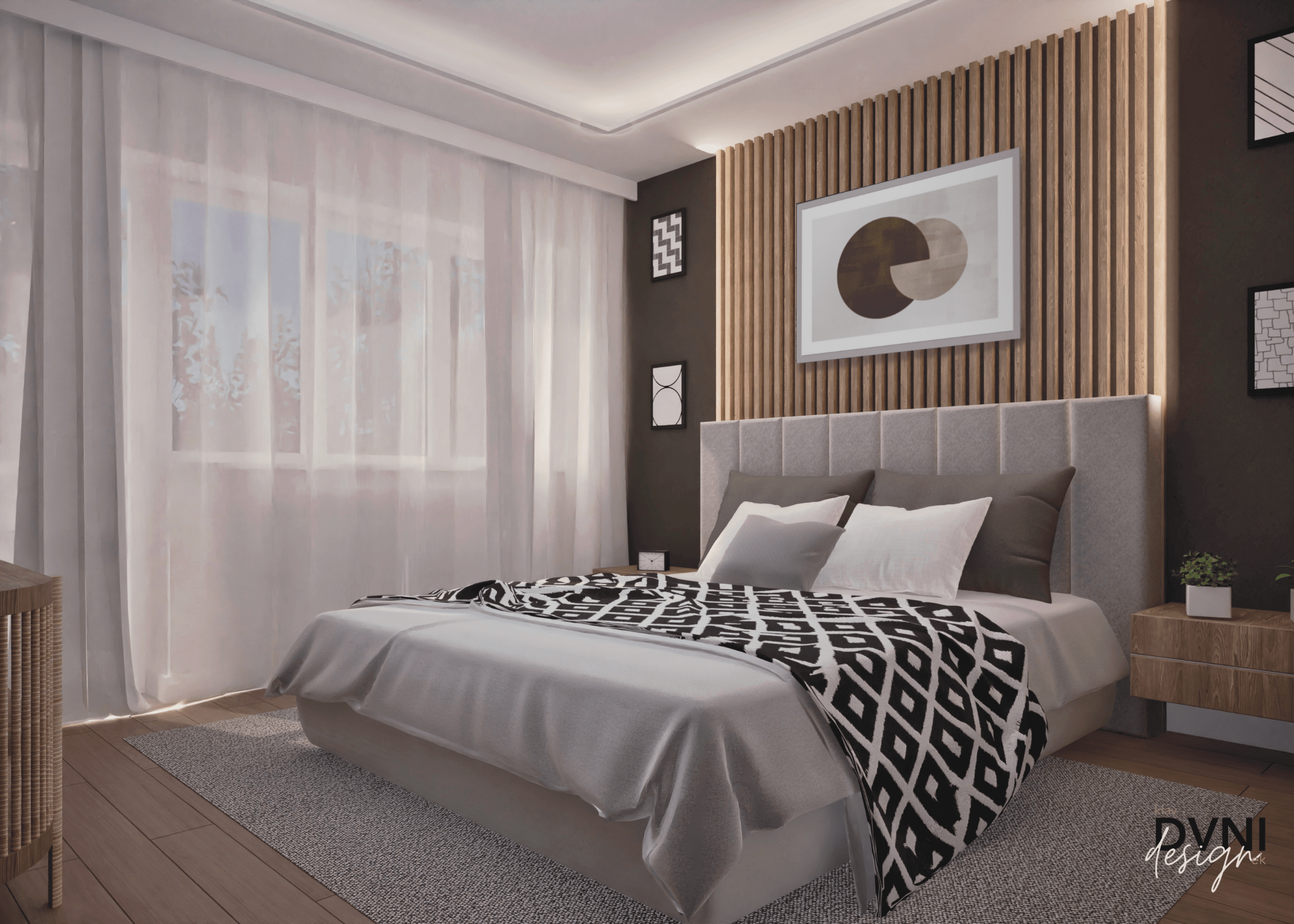 Sypialnia zaprojektowana jest w stylu skandynawskim, a przestrzeń pomieszczenia została utrzymana w ciepłych kolorach, dzięki czemu zyskało ono bardzo przytulną aurę. Ciemne ściany tworzą ciekawy kontrast, a całość dopełnia podwieszony sufit, który optycznie nadaje wnętrzu głębi.